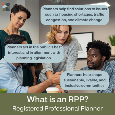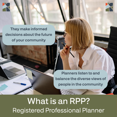 Registered Professional Planners (RPPs) are accredited planners who have completed years of rigorous training and who are bound by professional standards and a code of ethics. Hiring an RPP comes with the added confidence of hiring a well-trained, objective, and experienced planner who is part of a valuable network of RPPs across the province.